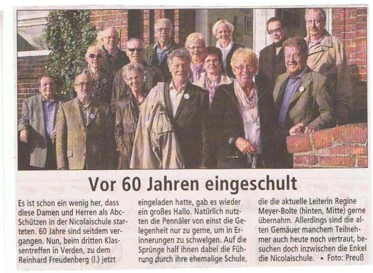 Schulführung am 21.09.2012. Diese ehemaligen Nicolaischüler und Schülerinnen hatten im Jahre 1952 ihre Entlassungsfeier und trafen sich nach 60 Jahren wieder in Verden. Leider waren zur Schulbesichtigung noch nicht alle eingetroffen. Es waren zwei sehr schöne Stunden mit vielen Erinnerungen und großem Erstaunen über die vielen Veränderungen.
