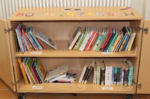 Herr Hauschildt von der Stadtbücherei las den aufmerksam lauschenden Kindern bei einem Bilderbuchkino die Geschichte „Pippilothek“ vor. Anschließend wurde der neue Büchertausch-Schrank eingeweiht, der ab jetzt immer bei Elternveranstaltungen geöffnet sein wird.
